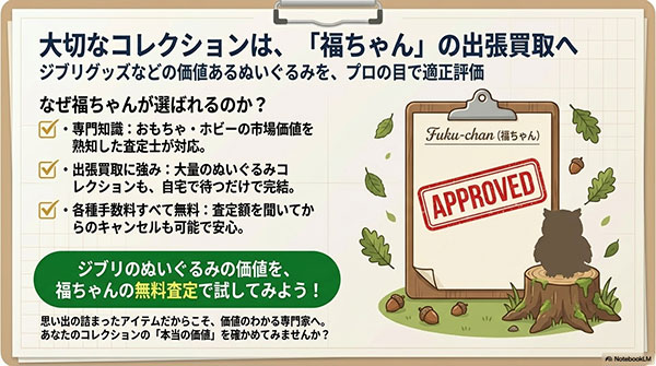 一般的なぬいぐるみは、重さ単位の安い査定になりがちです。 一方で「福ちゃん」のような専門店なら、ジブリ作品としての価値をしっかり評価してくれます。