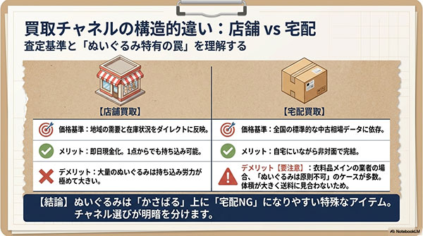 店舗買取は地域の需要を基準にし、宅配買取は全国の中古相場を基準にするため買取価格に違いが生じます。