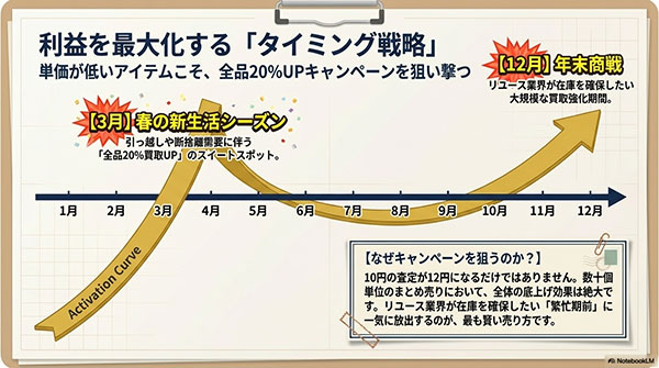 | 春の新生活応援(3月等) | 全品の買取金額が20%アップ | お店が混雑して待ち時間が長くなる |